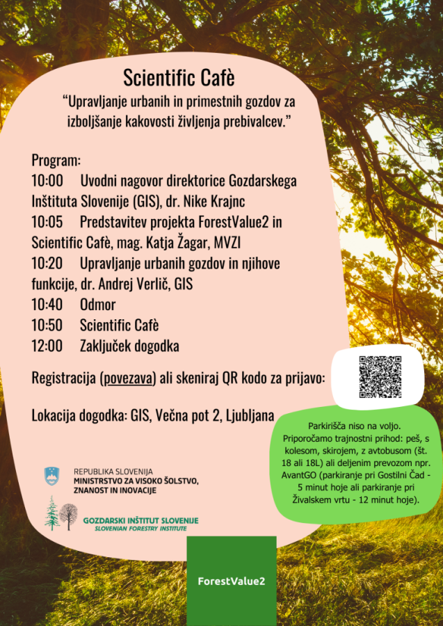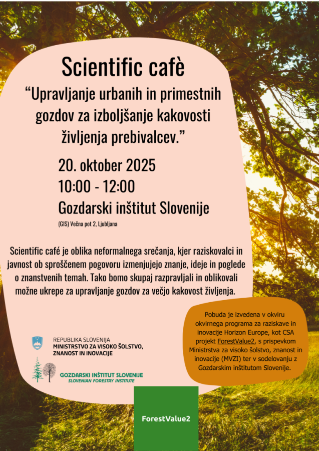 Within the ForestVlaue2 project, with the support of the Ministry of Higher Education, Science and Innovation of Sloveniaand in collaboration with the Slovenian Foresty Institute, a Scientific Café will be held this October on the topic: “Management of Urban and Peri-Urban Forests for Improving Residents Quality of Life.”
